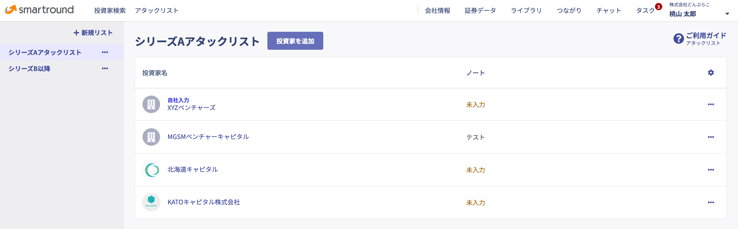 投資家検索機能・アタックリスト機能は、スタートアップが資金調達の際に投資家を検索し、アプローチしたい投資家をアタックリストに追加してステータスや面談記録を管理することができる機能です。smartroundでスタートアップのアカウントを作成している方であれば、どなたでも無料でご利用いただけます。