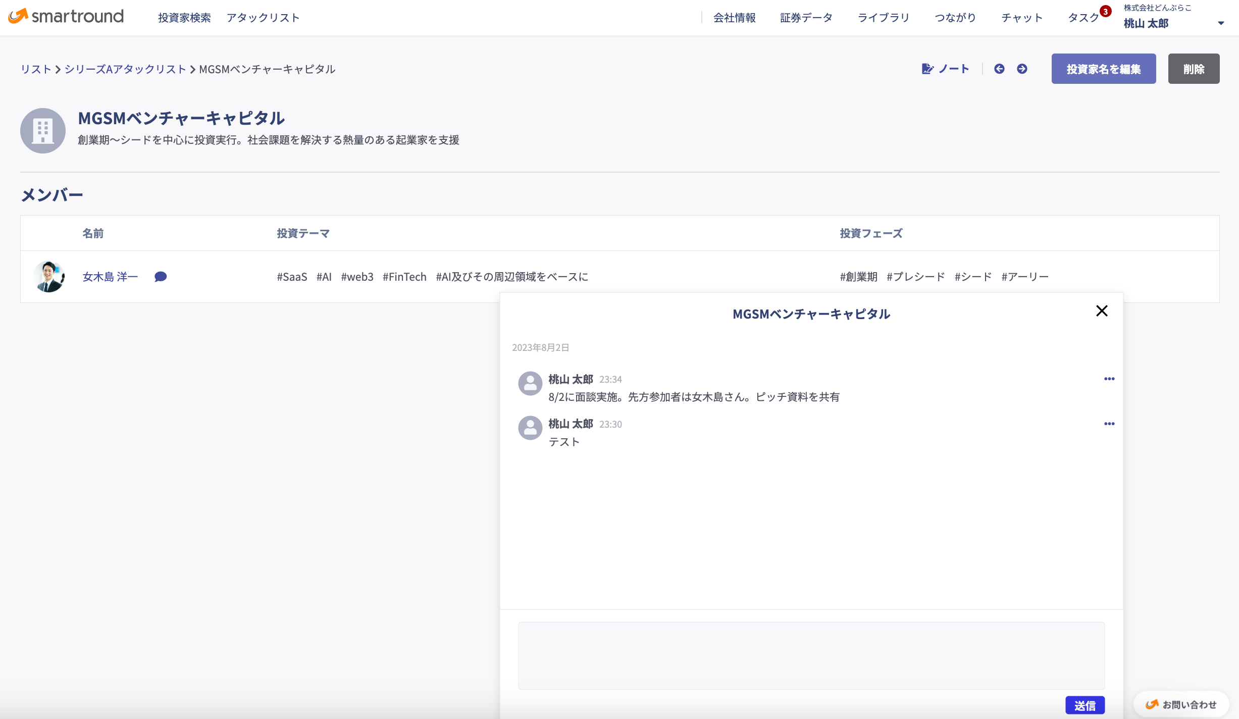 投資家につながり申請を送信したり、smartround上のチャットでコミュニケーションを取ることができます。