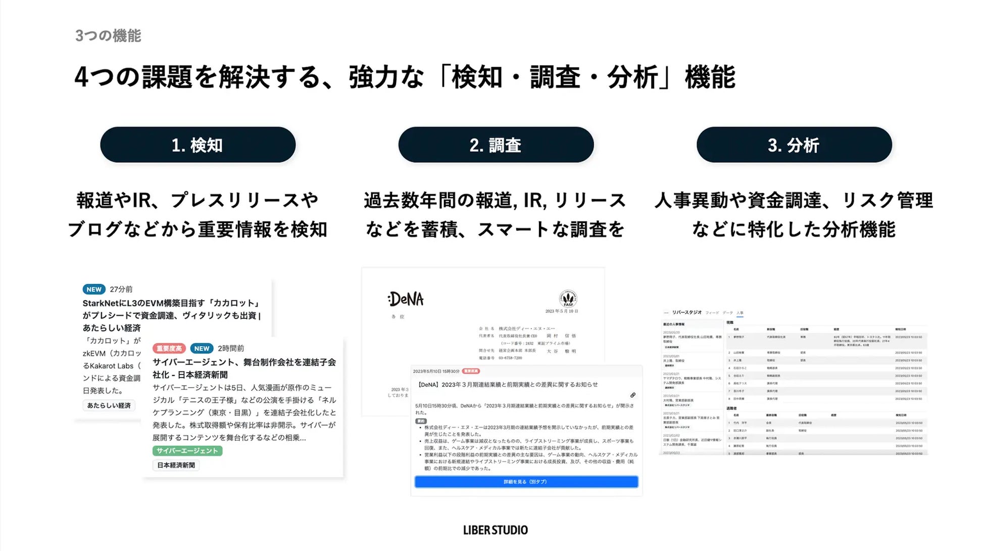 これまで RSS や検索に頼っていた情報収集と調査業務について、 AI を活用したスマートな機能に置き換えることで、リサーチ・分析業務を劇的に効率化することが出来ます。