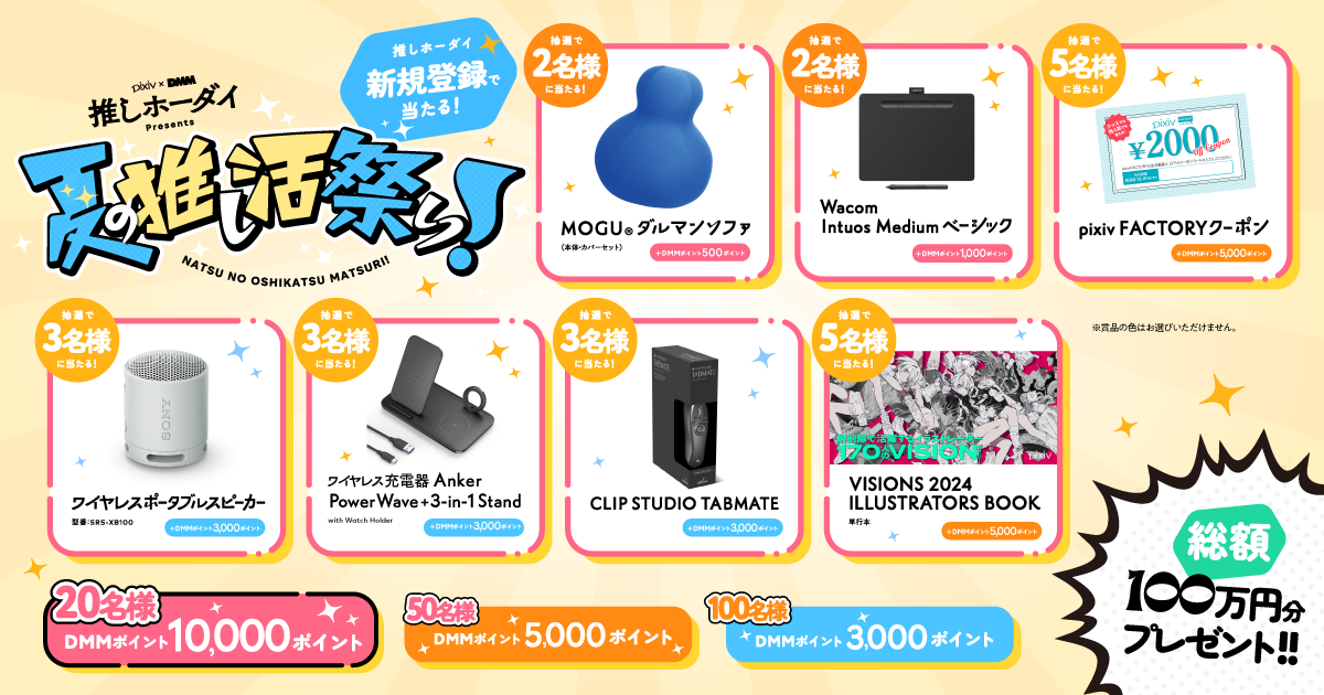 期間中に新規で「pixiv × DMM推しホーダイ」に登録いただいた方の中から抽選で、お絵かきサポートグッズやお家での推し活を盛り上げるグッズなど総額100万円分の豪華賞品をプレゼントいたします。