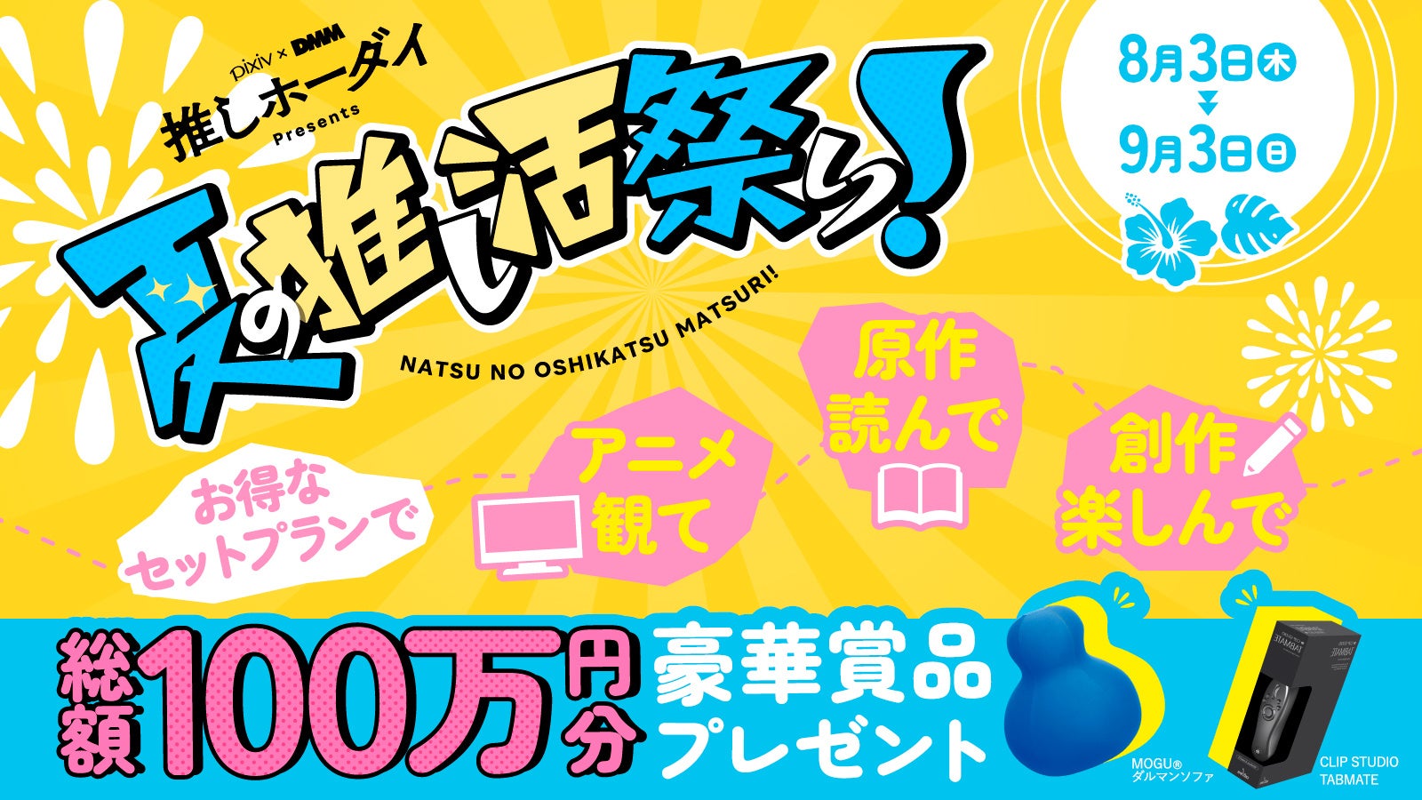 今回開催する「pixiv × DMM推しホーダイ 夏の推し活祭り!」は、夏アニメなどが盛り上がるこの季節に合わせて、アニメ・エンタメ作品鑑賞や創作を楽しむユーザーの推し活を応援する「pixiv×DMM推しホーダイ」 プランならではのキャンペーンとなっています。この機会にぜひご登録ください。