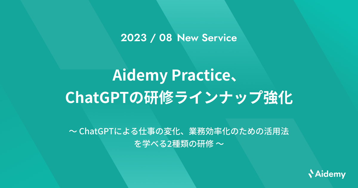 従来よりAidemy Practiceでは、クライアントのニーズに合わせてカスタマイズ研修を提供してまいりましたが、ChatGPTに関する研修の問い合わせが日々増加していたことから、この度ChatGPTの研修ラインナップを強化いたしました。ChatGPTの仕事への影響について理解を深めたい方向けの講演形式の研修『ChatGPTで変わる「優秀な人材」』、ChatGPTの仕事での活用方法を初歩から学びたい方向けのハンズオン研修『業務効率化のためのChatGPT 入門編』の2種類を提供開始しております。