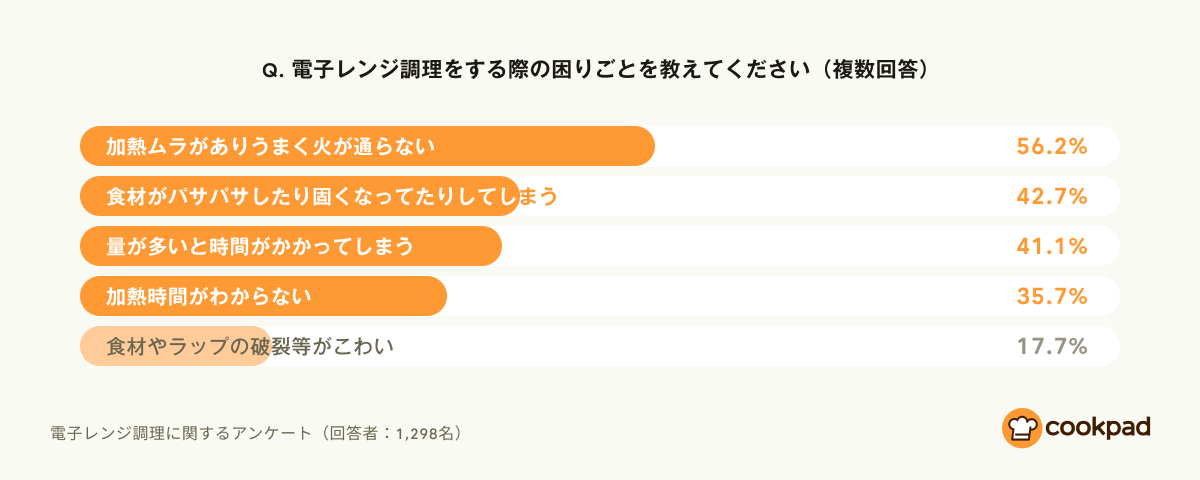 電子レンジ調理をする際の困りごと尋ねたところ、「加熱ムラがありうまく火が通らな