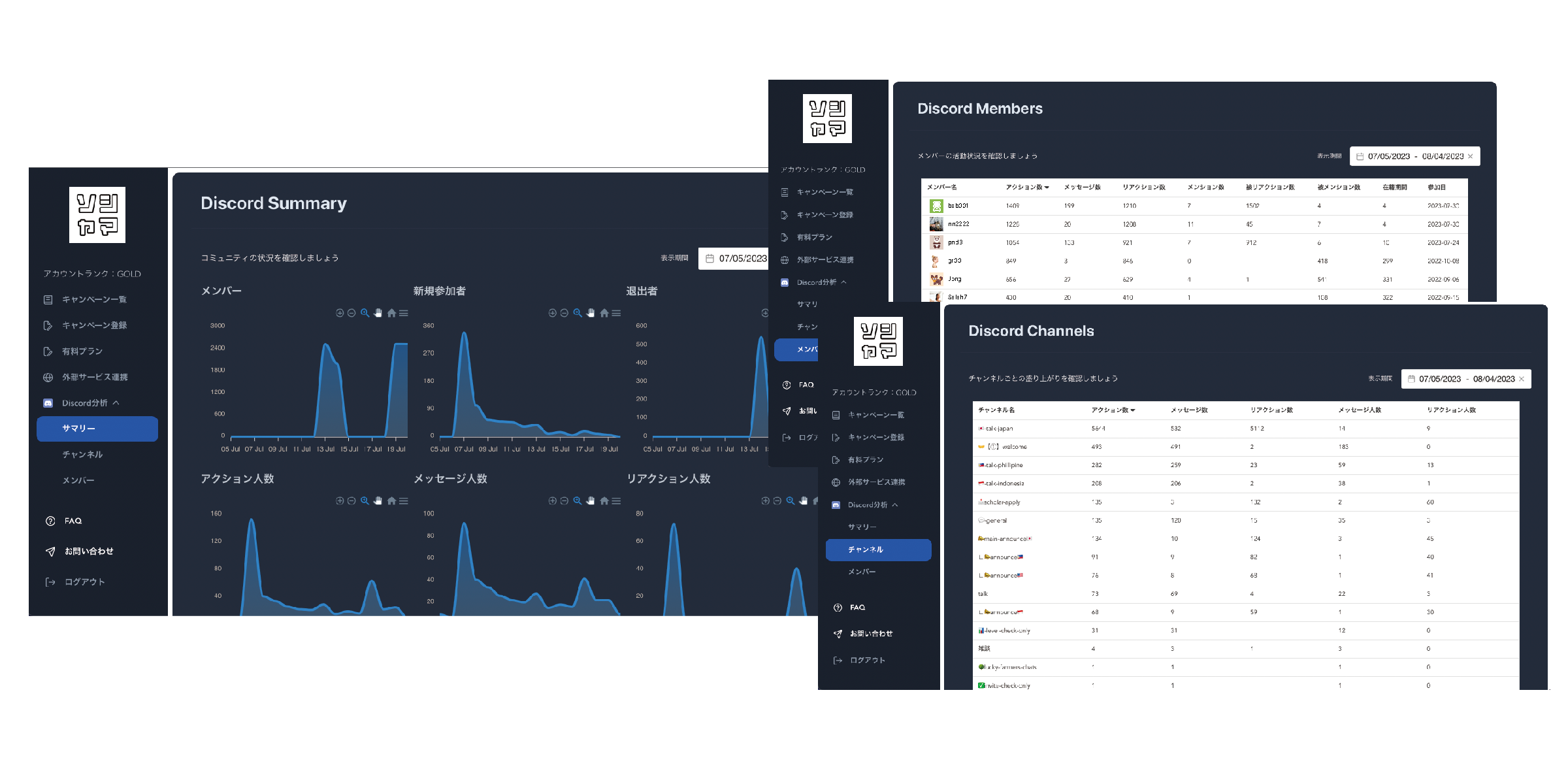 サーバーへの参加・退出人数はもちろん、アクション人数や活発にアクションしている参加者を可視化できるようになりました。メンバーとチャンネルの盛り上がりも項目ごとに並び替えて確認可能です。