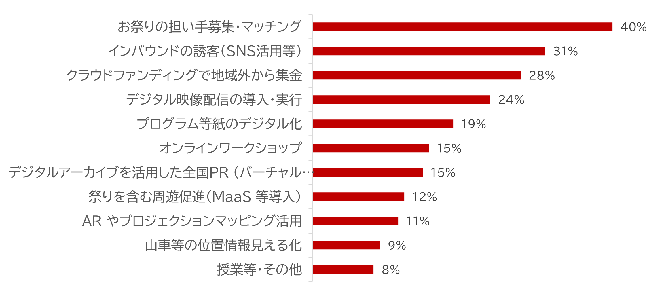 デジタルの活用方法のうち、運営面では、「運営スタッフのオンラインミーティング(46%)」、「運営マニュアルのデジタル化(37%)」、「多言語対応(28%)」等のニーズが高いこと、発信面では「お祭りの担い手募集・マッチング(40%)」、「SNS等を活用したインバウンドの誘客(31%)」、「クラウドファンディングの活用(28%)」、「デジタル映像配信(24%)」等に対するニーズが高いことが明らかになりました。