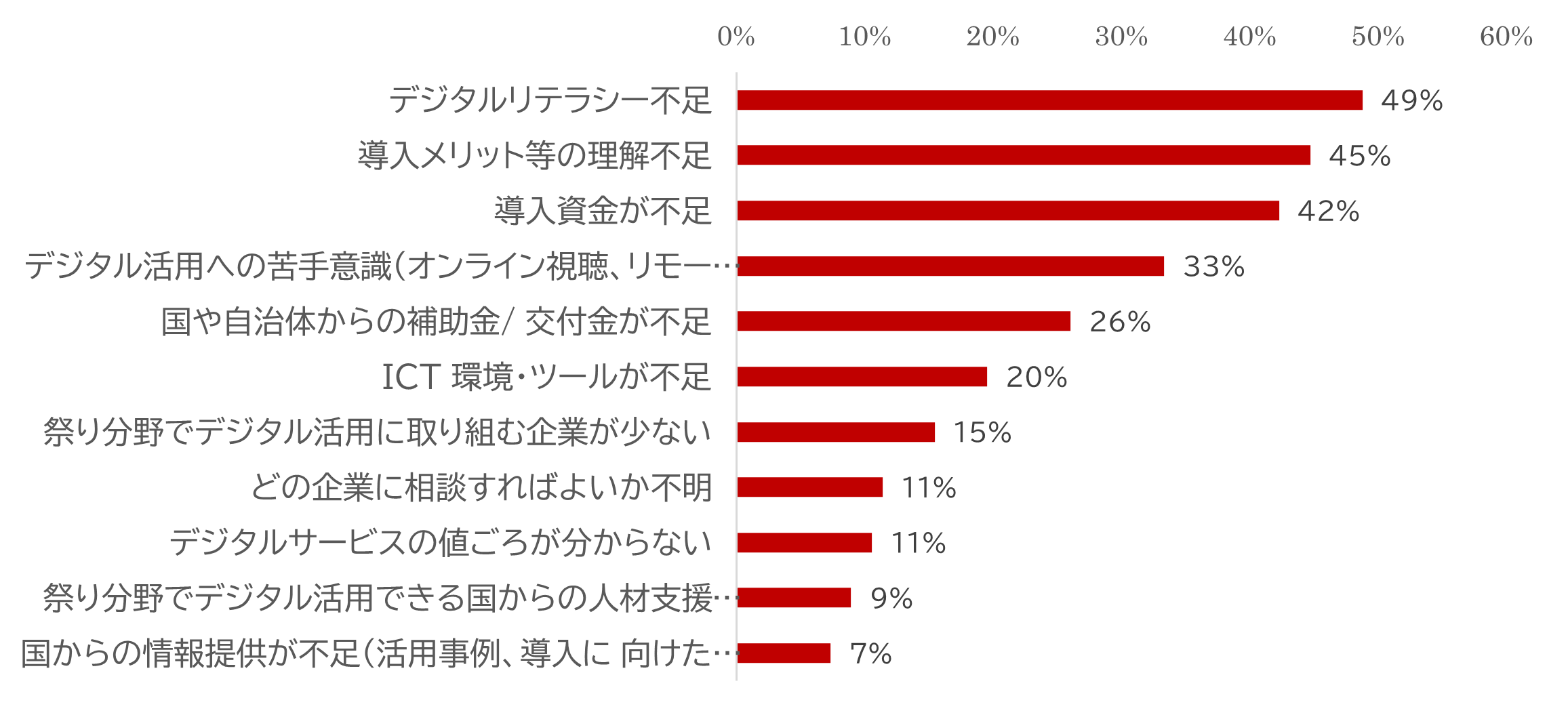デジタルを活用するにあたっての課題は、デジタルリテラシー不足(49%)、導入メリット等の理解不足(45%)、導入資金不足(42%)が特に高く、デジタルリテラシー不足については、より小規模なお祭り(1万人未満)が特に顕著(54%)であることが分かりました。