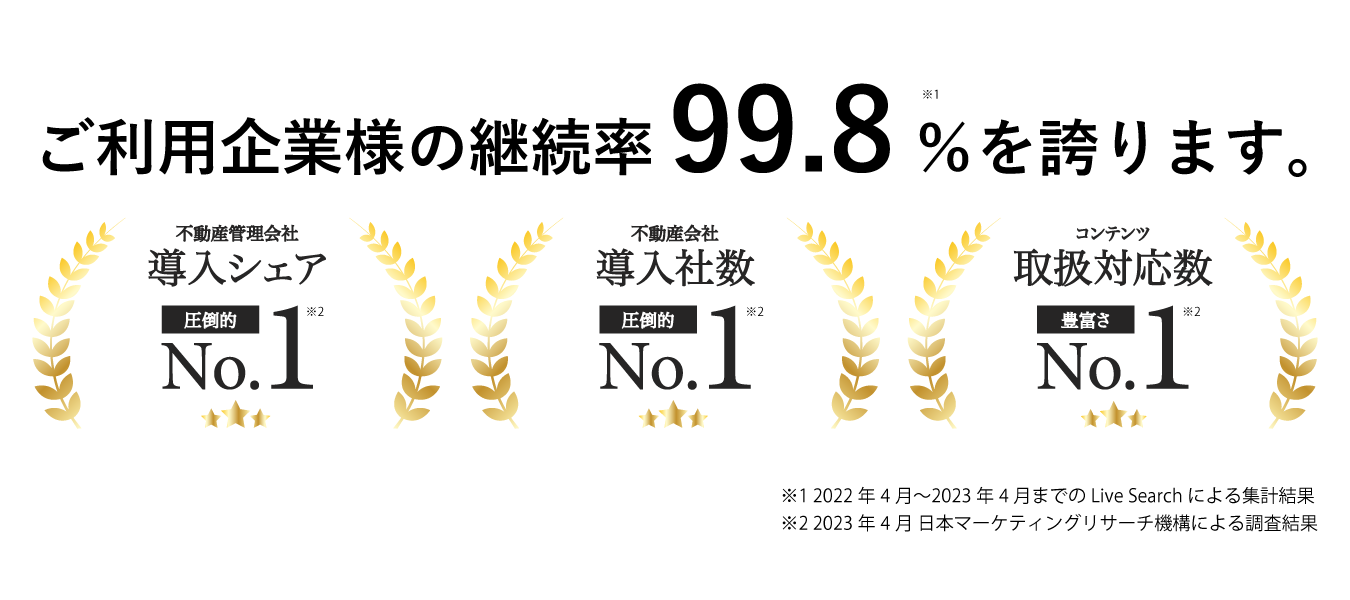 2023年4月に行った日本マーケティングリサーチ機構の調査により、物件撮影・間取り図作成代行クラウドサービス「Req」は、3部門においてNo.1を獲得いたしました。物件写真・間取り図・360°パノラマVR・動画・3DCGバーチャルホームステージングのコンテンツに対応しており不動産物件コンテンツを全て網羅しているのはLive Search Reqのみとなります。