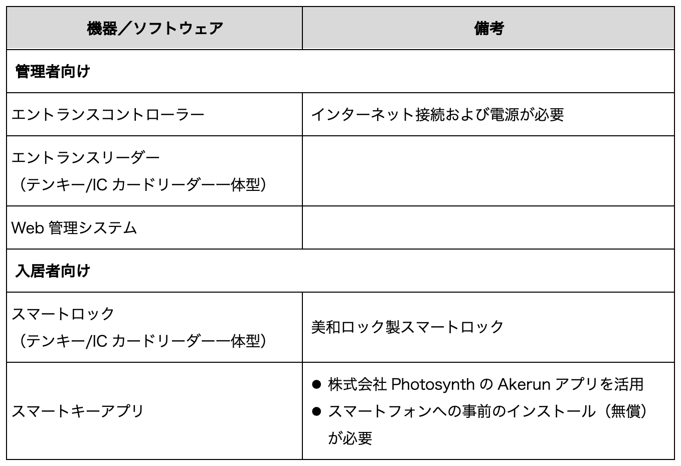 「Akerun.Mキーレス賃貸システム」の構成は以下の通りです。