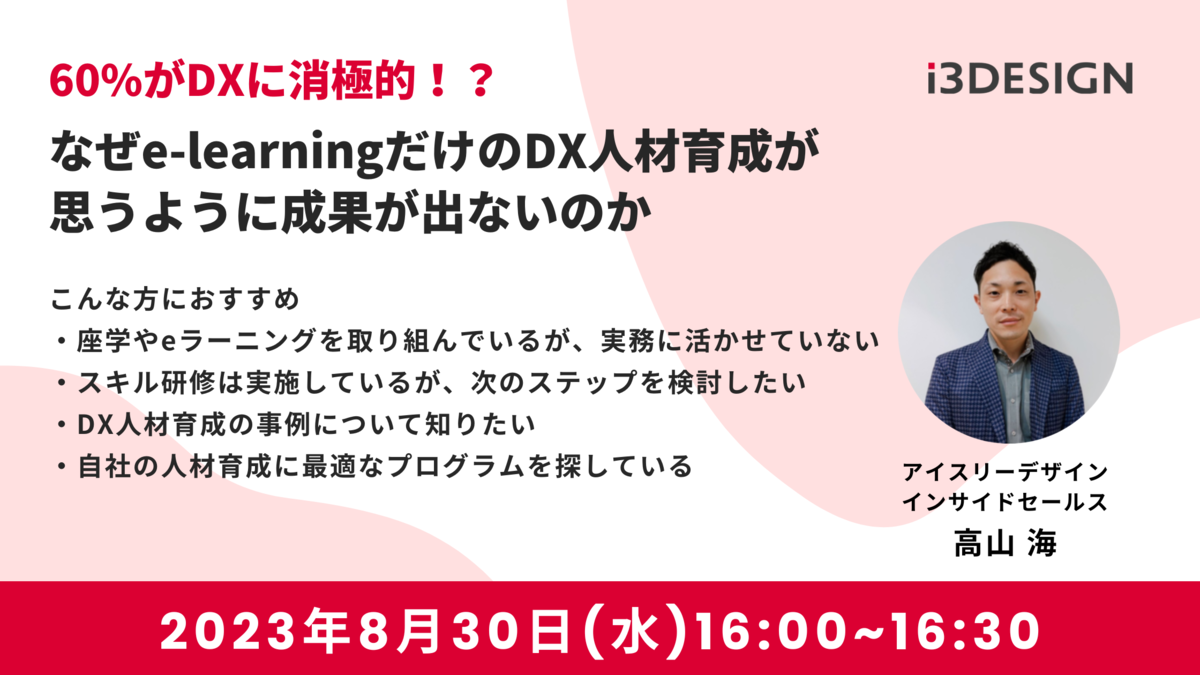 本説明会では、DX推進の現状と課題やDX人材に必要なスキルやマインドについて、またそれを実現する超実践型ワークショップ「ヒューマンイノベーションプログラム」をご紹介いたします。実際にご導入いただいているクライアント様の事例やアウトプットイメージもご紹介しますので、是非この機会にご参加ください。