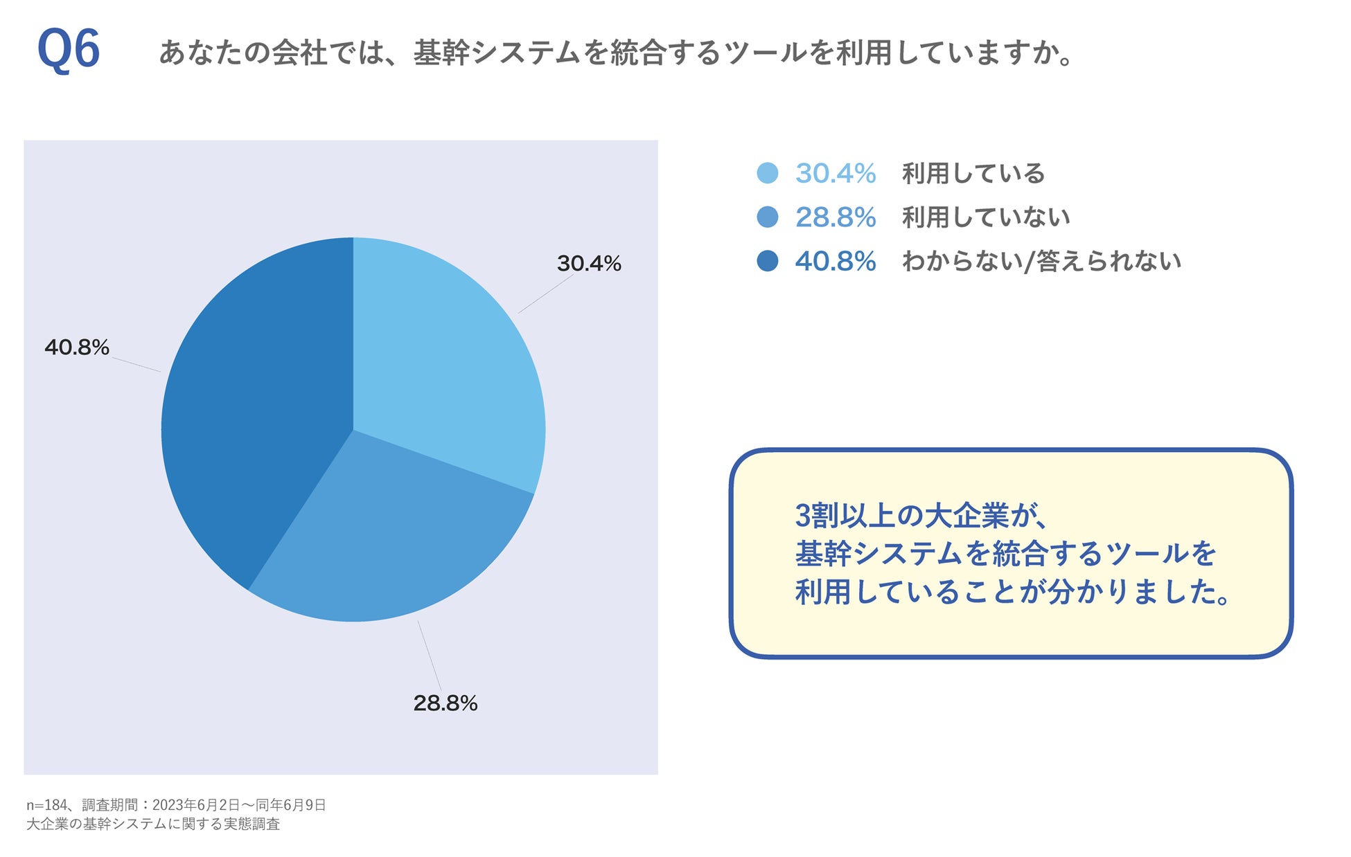 「あなたの会社では、基幹システムを統合するツールを利用していますか。」と質問したところ、「利用している」が30.4%、「利用していない」が28.8%という回答となりました。