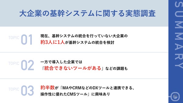 基幹システム統合ツールを利用していない大企業の3社に1社が基幹システムの統合を検討~半数近くが「MAやCRMなどのDXツールと連携できる、操作性に優れたCMSツール」に興味あり~