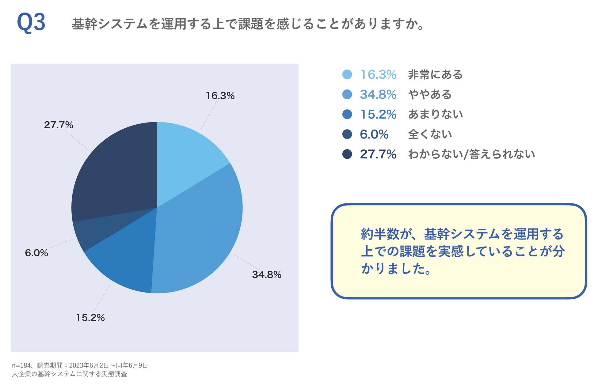 「基幹システムを運用する上で課題を感じることがありますか。」と質問したところ、「非常にある」が16.3%、「ややある」が34.8%という回答となりました。