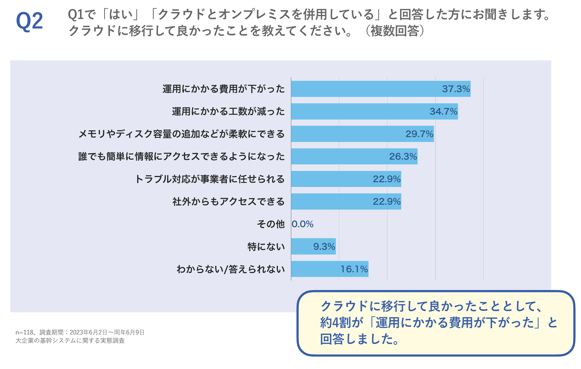 クラウドに移行して良かったこととして、約4割が「運用にかかる費用が下がった」と回答