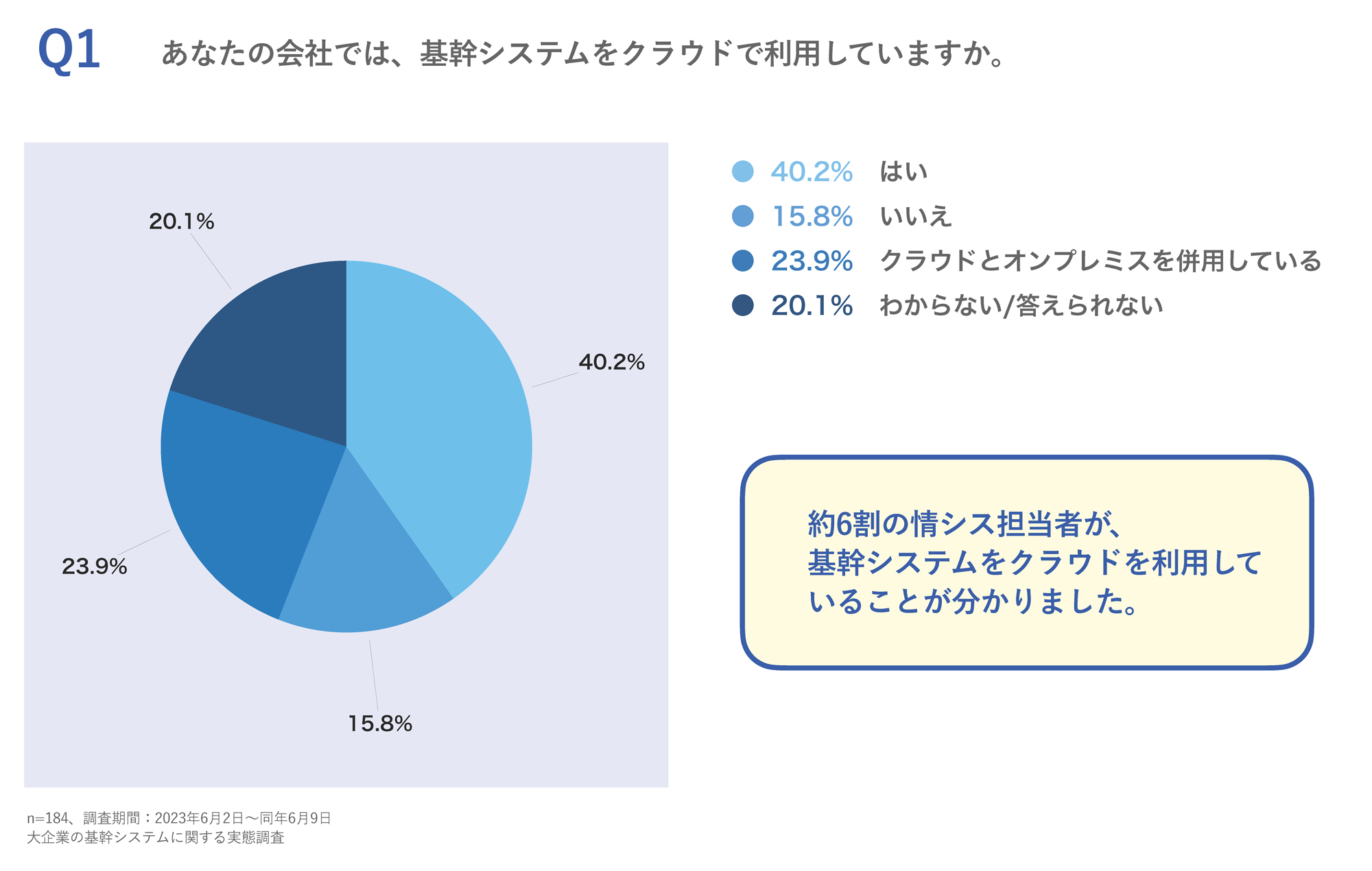 「あなたの会社では、基幹システムをクラウドで利用していますか。」と質問したところ、「はい」が40.2%、「クラウドとオンプレミスを併用している」が23.9%という回答となりました。