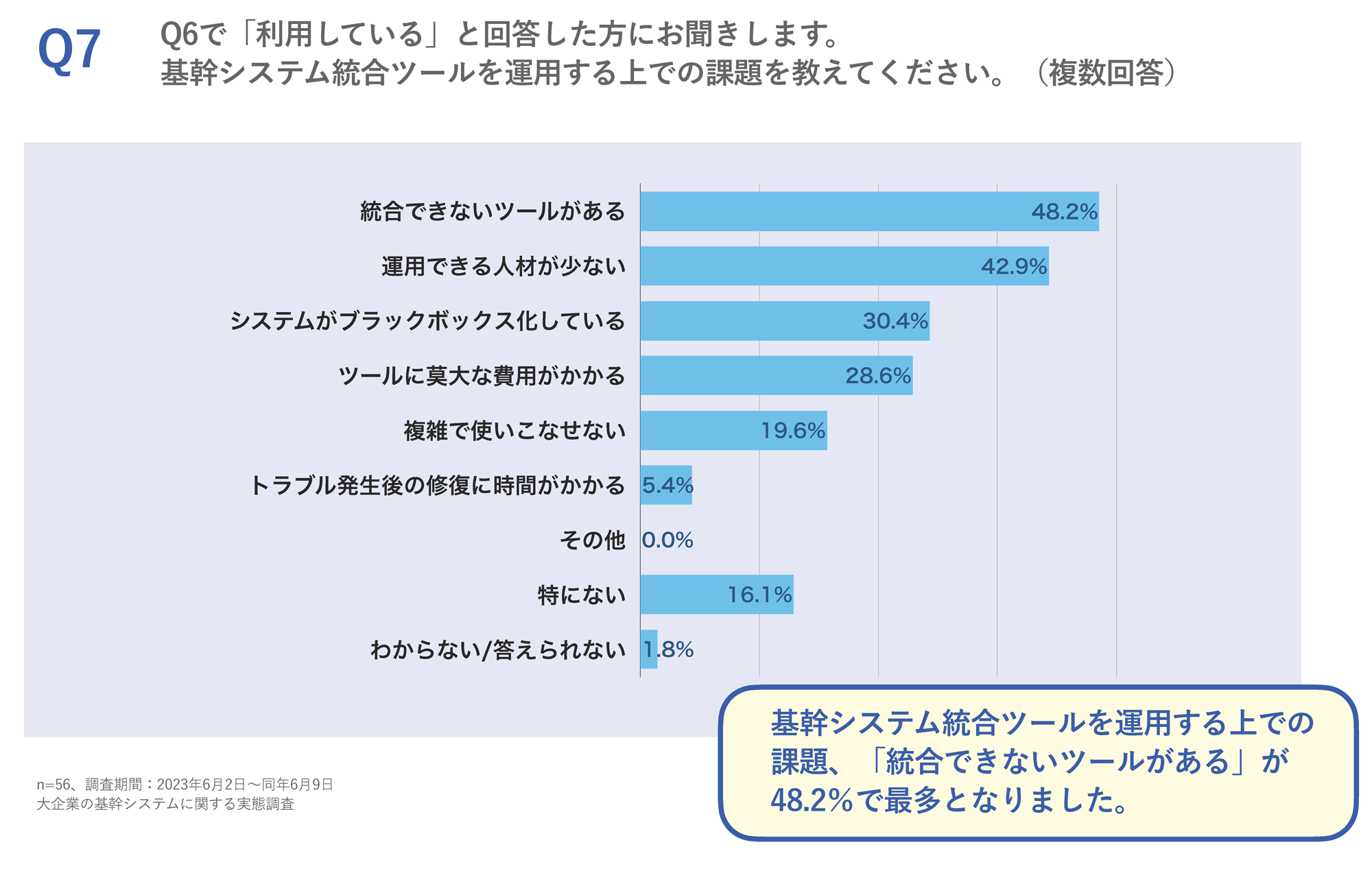 「利用している」と回答した方に、「Q7.基幹システム統合ツールを運用する上での課題を教えてください。(複数回答)」と質問したところ、「統合できないツールがある」が48.2%、「運用できる人材が少ない」が42.9%、「システムがブラックボックス化している」が30.4%という回答となりました。