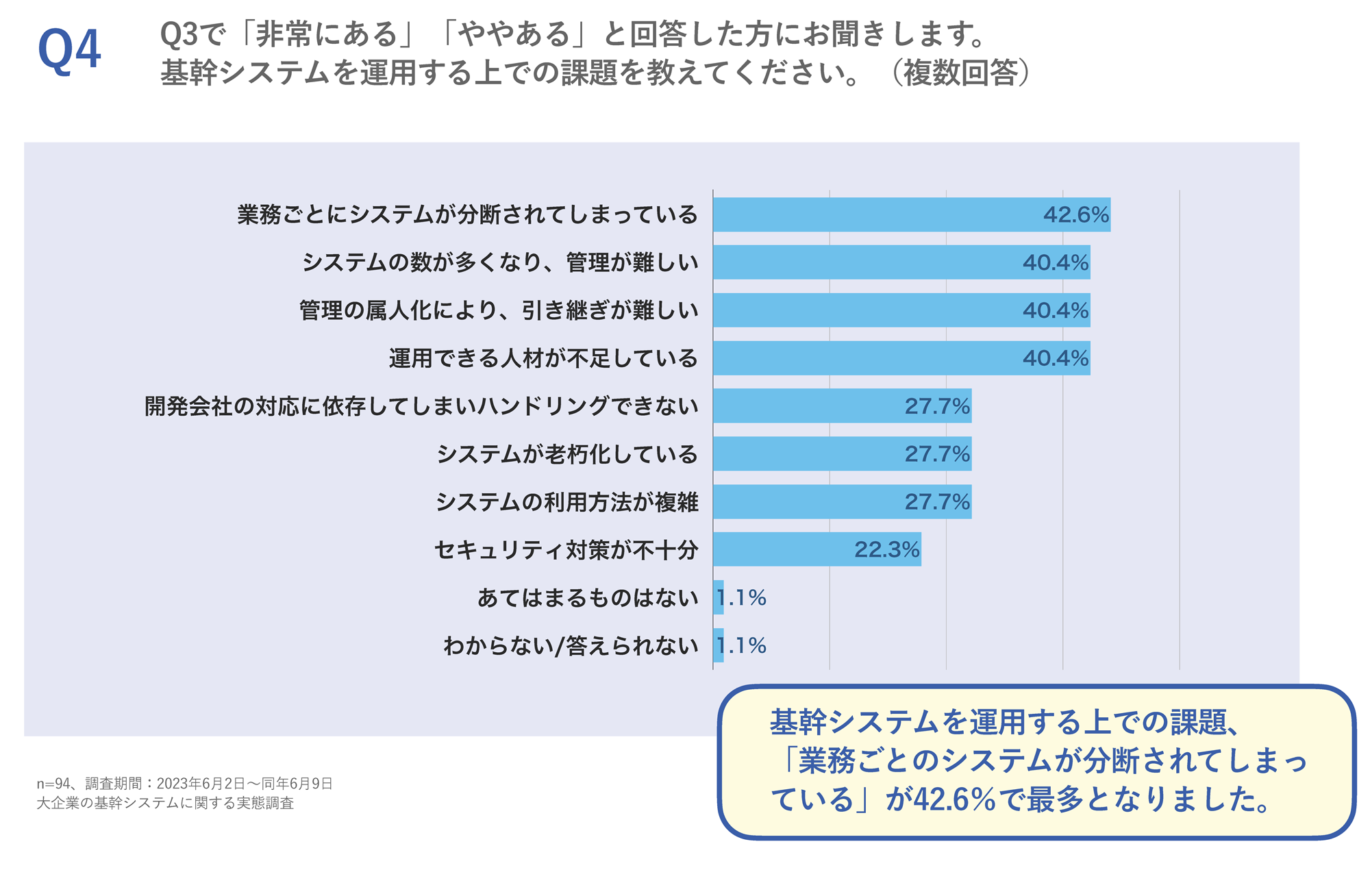 「非常にある」「ややある」と回答した方に、「Q4.基幹システムを運用する上での課題を教えてください。(複数回答)」と質問したところ、「業務ごとにシステムが分断されてしまっている」が42.6%、「システムの数が多くなり、管理が難しい」が40.4%、「管理の属人化により、引き継ぎが難しい」が40.4%、「運用できる人材が不足している」が40.4%という回答となりました。