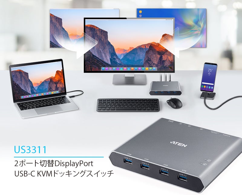 本製品はPC、スマートフォンやタブレットなどUSB-TypeC対応のデバイス2台を切り替え、DisplayPort対応モニターでの表示、操作が可能となるドッキングスイッチです。