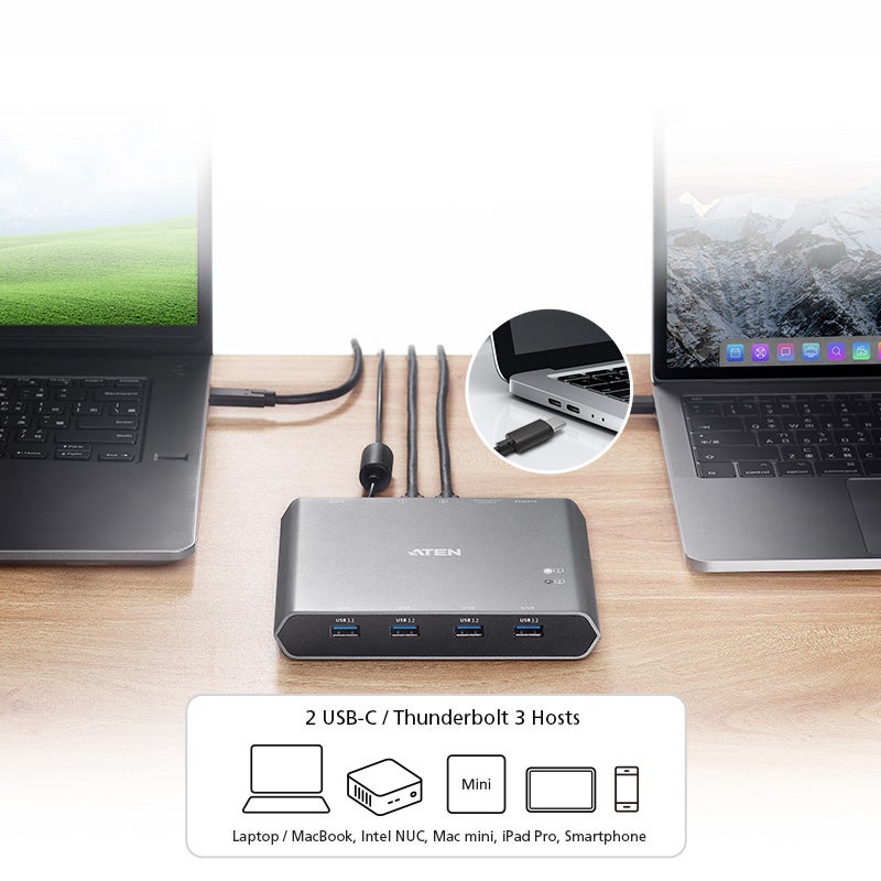本製品はUSB3.2 Gen1準拠のUSBポートで4つのデバイスの接続ができ、それらを2台のPCやタブレットで共有し、スイッチ一つで操作の切り替えができるため、ユーザーの操作効率が向上します。
