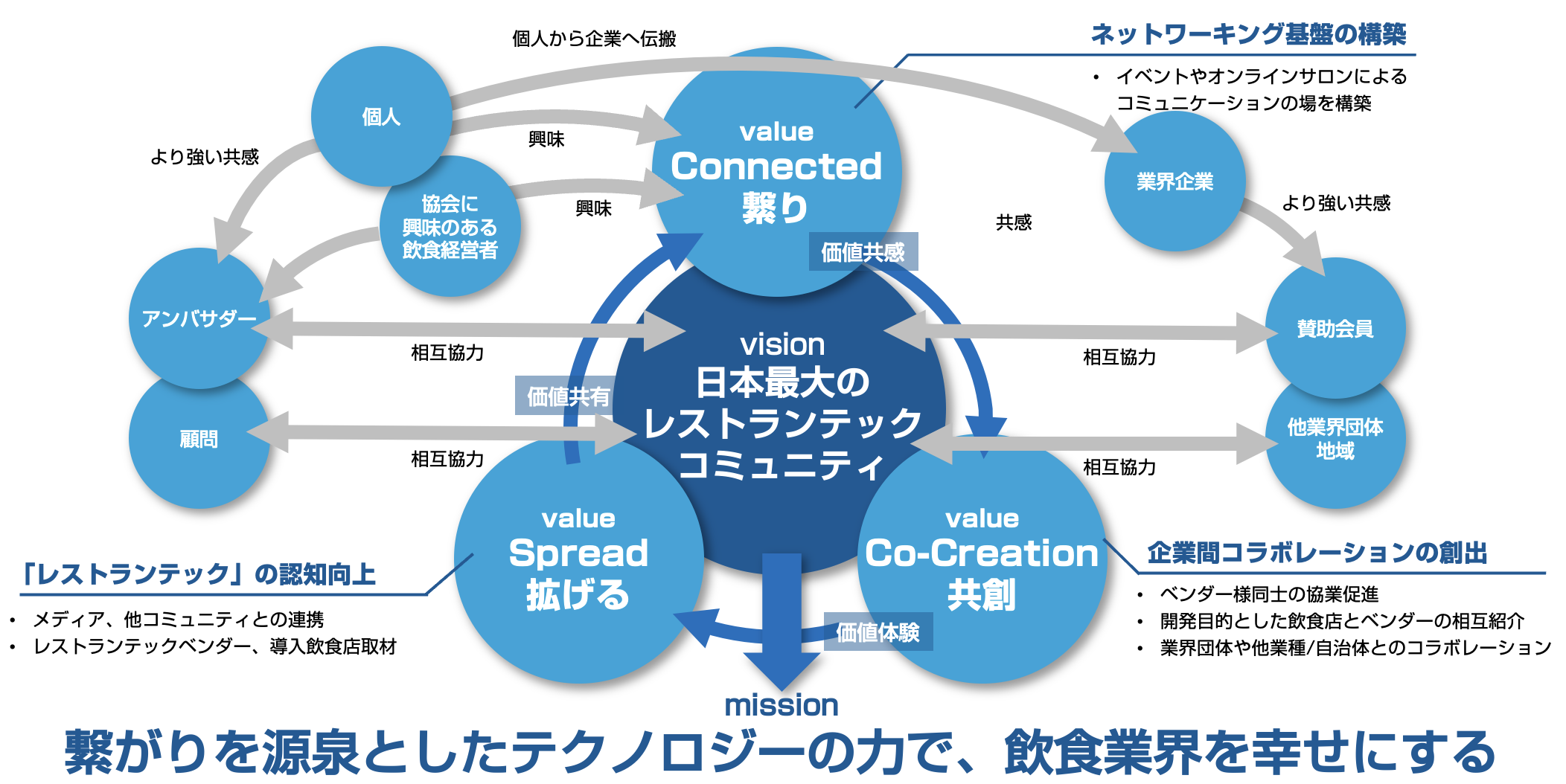 「テクノロジーの力で、飲食業界を幸せにする」をミッションに、テクノロジー企業を中心とした賛助会員の皆様をはじめ、業界企業や団体の皆様と共に、数多くのイベントやコミュニティ運営を通じて、飲食DXの普及活動を行なっております。