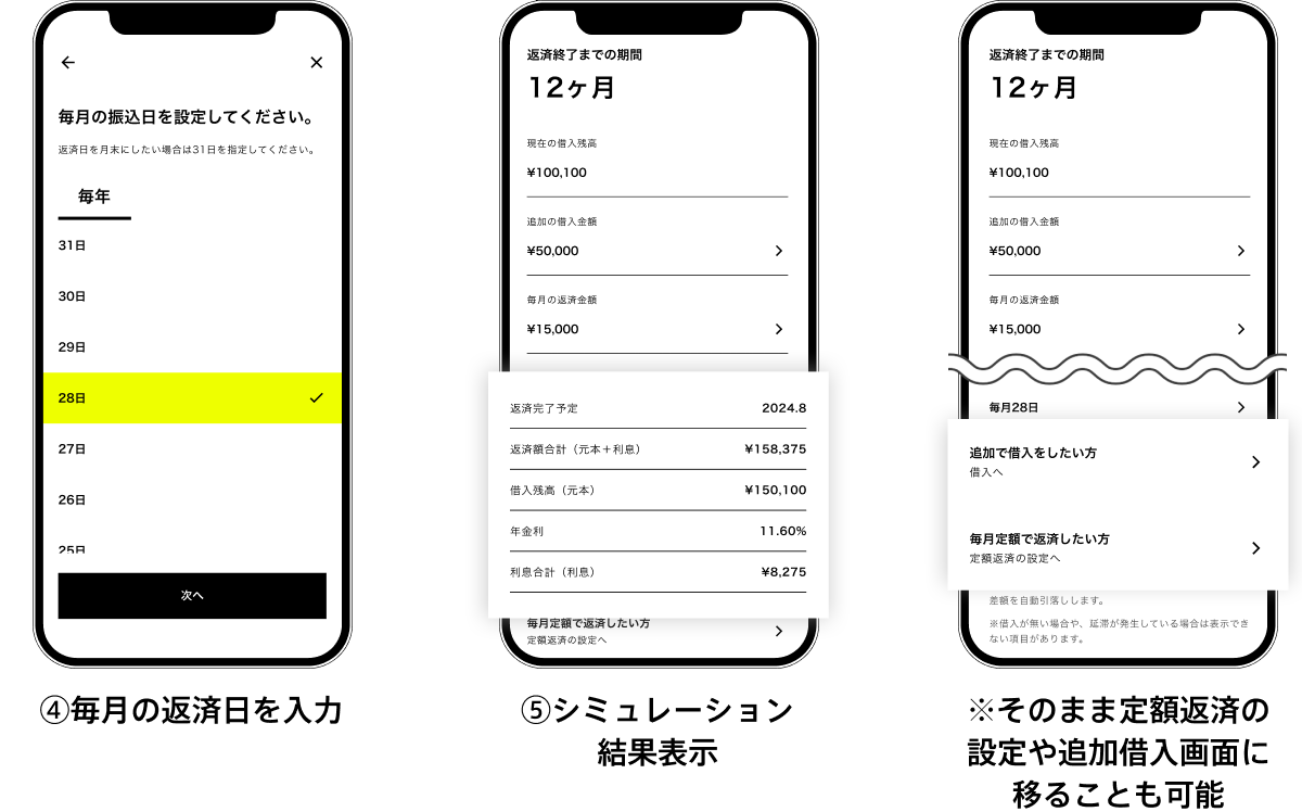 給料日翌日など、口座残高が増えるタイミングを返済日にしておくことで、計画的な返済をサポートします。