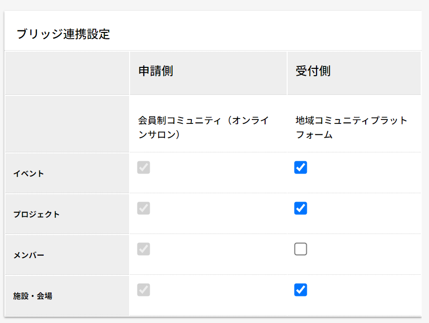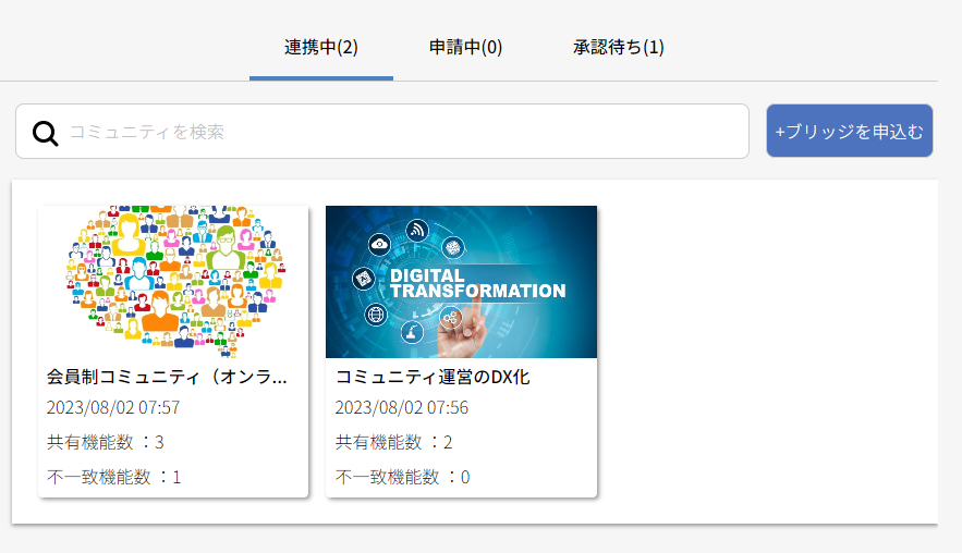 コミュニティで運営管理しているイベント、プロジェクト、施設、メンバー、動画をほかのコミュニティから連携申請することにより、承認されると連携ができるようになり、連携先に所属するメンバーが相互に情報を閲覧できるようになります。