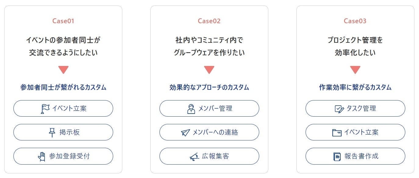 内容:標準機能(イベント管理、プロジェクト管理、コミュニティ管理)がすべて利用可能