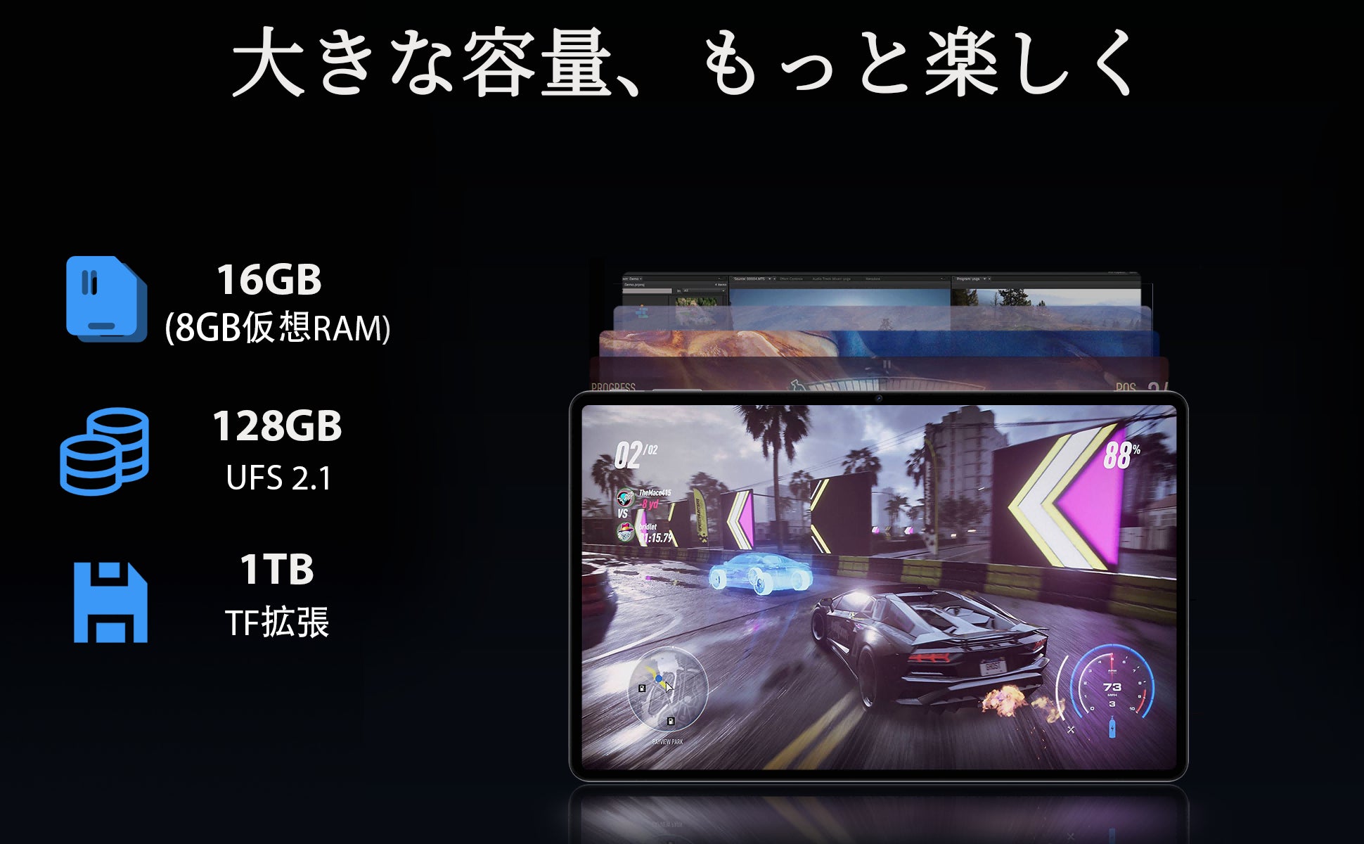 - 16GB(8GB+8GB 拡張)RAM+128GB ROM+1TB拡張可能