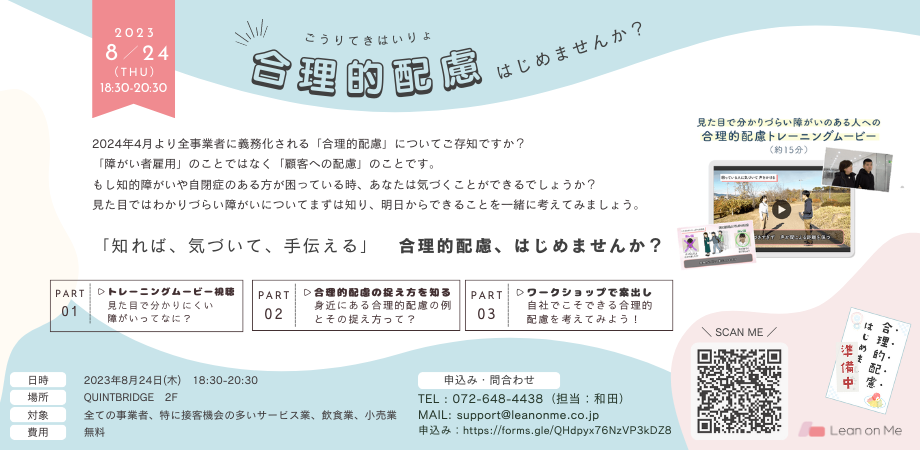 合理的配慮について、より具体的に考えていただく機会を設けるため、下記のイベントを開催いたします。他事業者との意見交換の時間もございます。