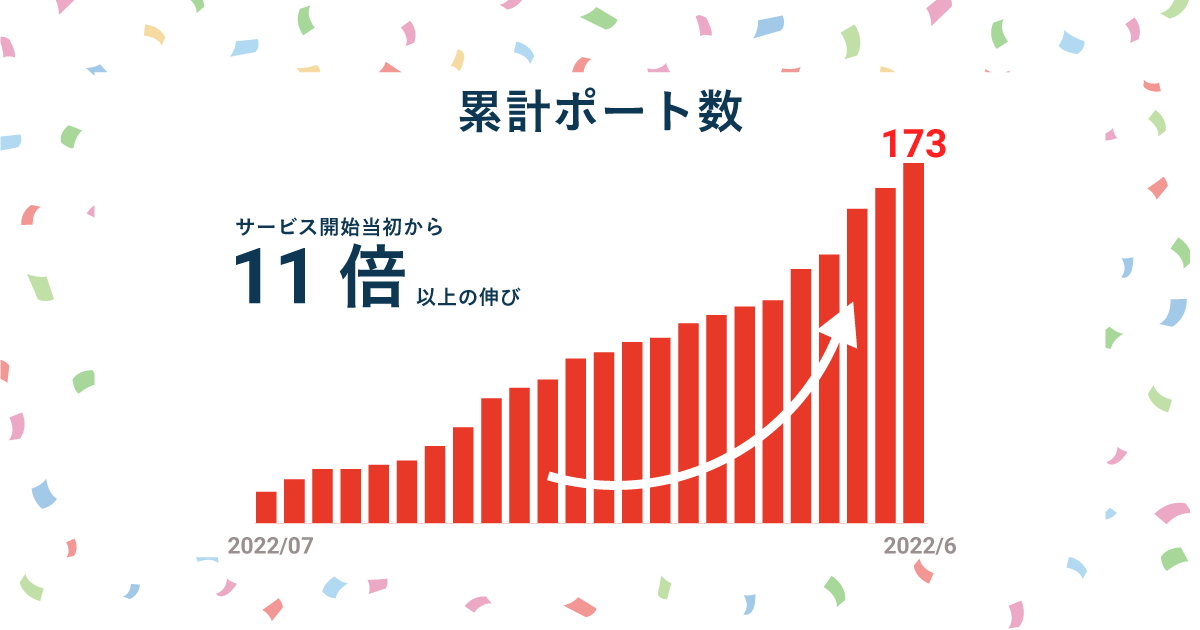 サービス開始当初15箇所だったポート数も173箇所(2022年6月末時点)と2年間で11倍以上に増加、高密度のポート設置によりまちの移動を支えております。