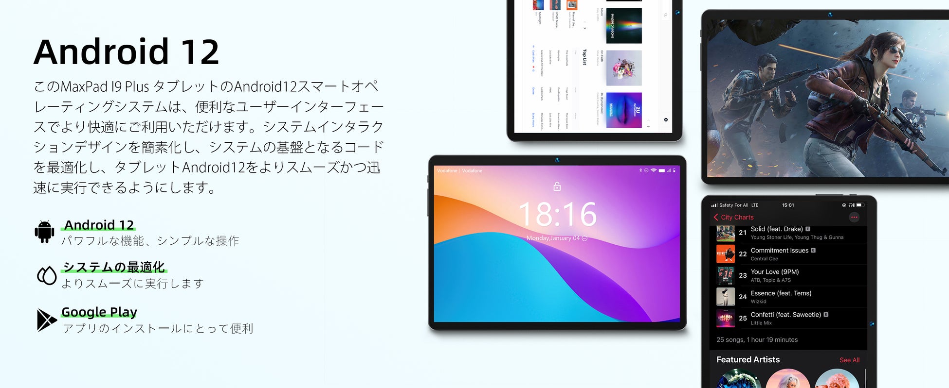 BMAX I9Plus タブレットは最新のAndroid 12 システムを搭載しています。 元の Android 11 システムと比較して、より安定した動作能力を備えています。 元の 4GB+64GB メモリから現在の 8GB+64GB メモリに拡張します。 収納スペースが大きくなったので、生活に残しておきたい写真、音楽、電子書籍をより多く保存できます。