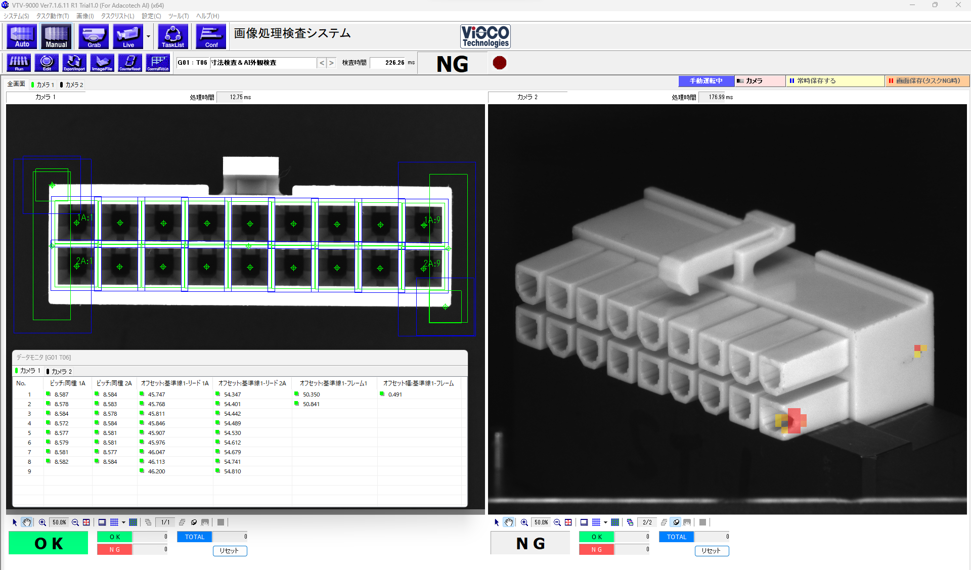 ヴィスコの実績ある撮像システムで画像を取得し、画像処理;ルールベースの判定で不良品と判定された部品をアダコテックAIでも検査します。過検出の低減、それによる本来は良品であった部品の救済が可能となります。