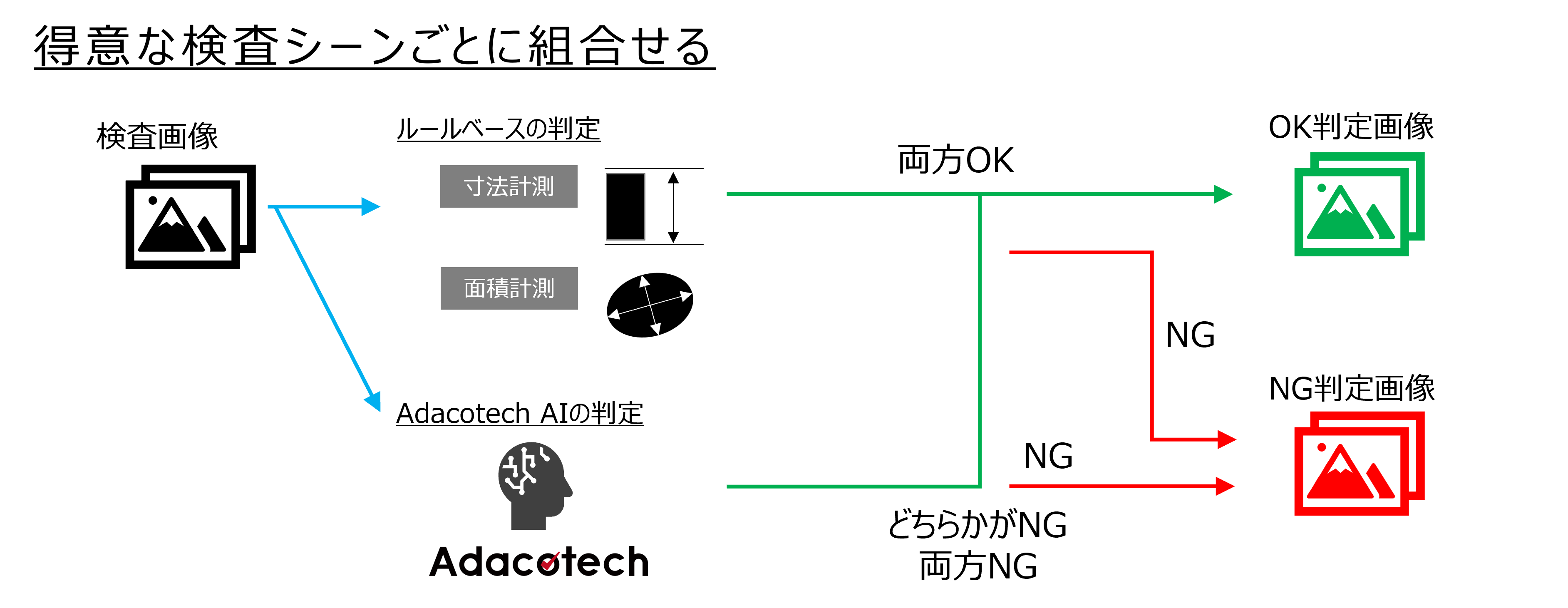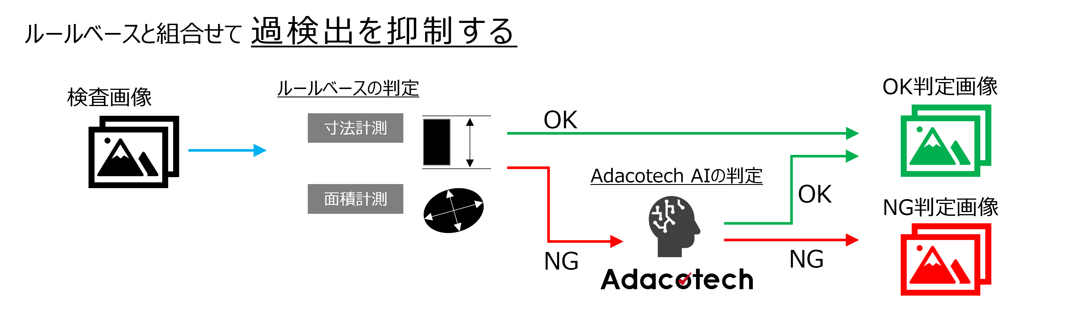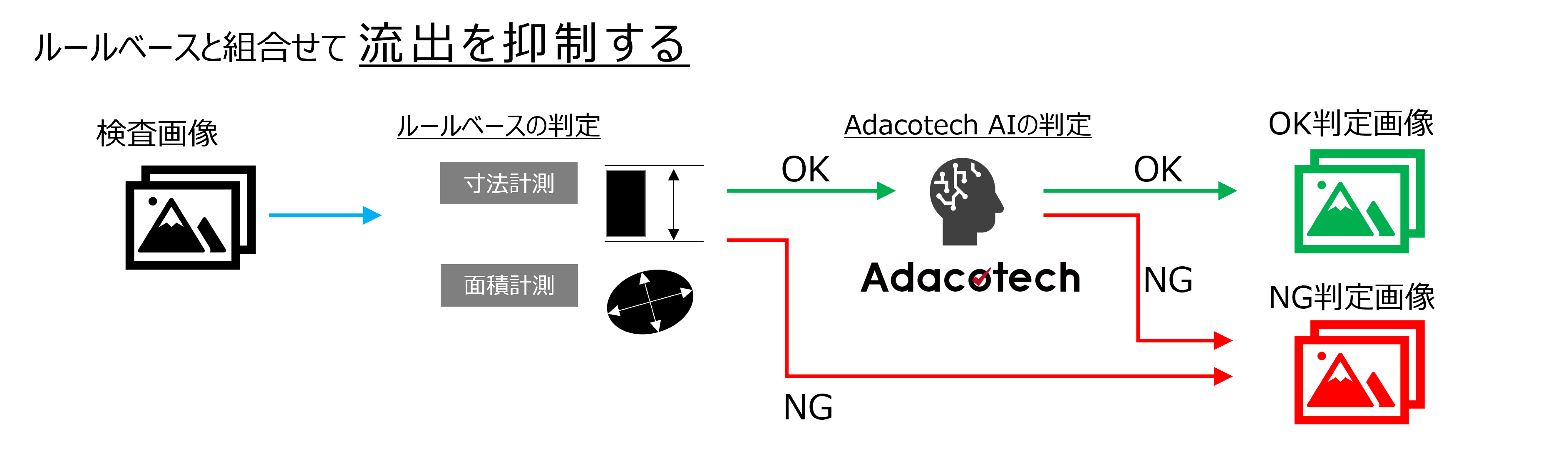 ルールベースの判定で良品と判定された画像をアダコテックAIでも検査し、どうしても防ぎきれなかった流出抑制に役立ちます。