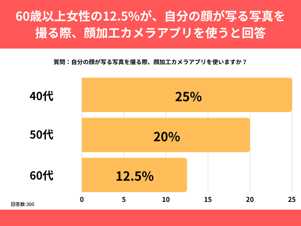自分の顔が写る写真を撮る際、顔加工カメラアプリを使うと回答した割合を年代別でみてみますと、40代が最も高く25%、次いで50代が20%、60代は12.5%という結果になりました。