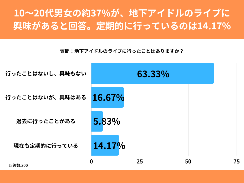 10~20代男女を対象とした「地下アイドルのライブに行ったことはありますか?」というアンケートで最も多かった回答は「行ったことはないし、興味もない」で63.33%でした。
