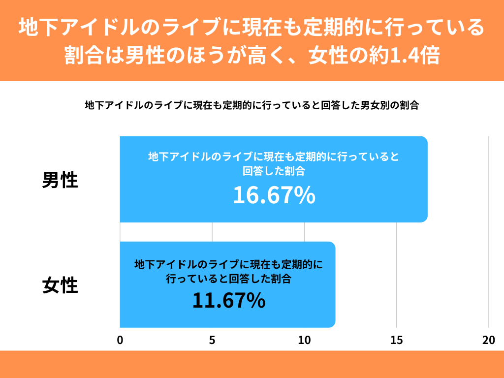 【地下アイドルのライブに現在も定期的に行っている割合は男性のほうが高く、女性の約1.4倍】
