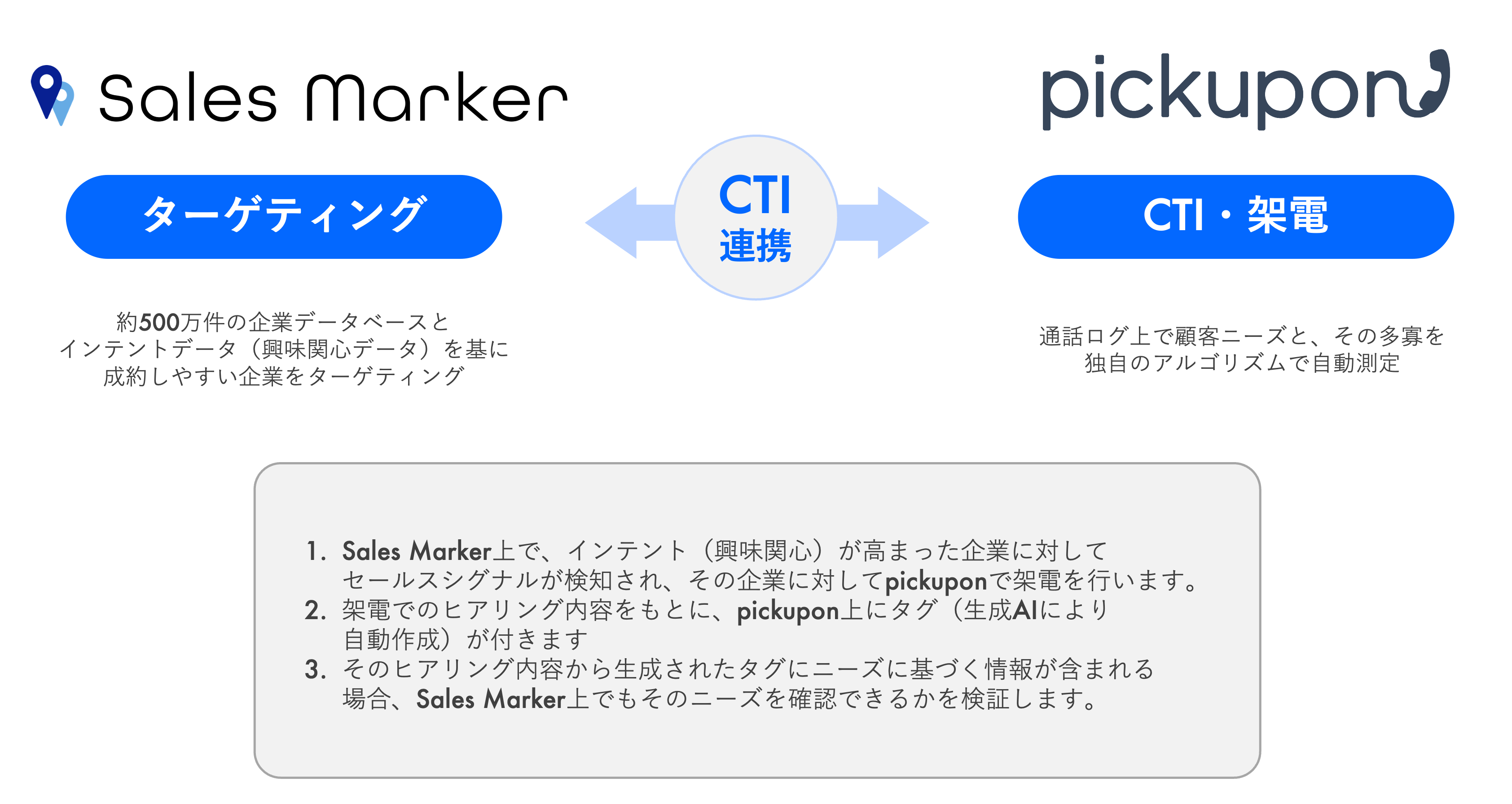 この共同PoCは、顧客の声を自動的にピックアップするpickuponと顧客のインテントデータ(興味関心データ)を活用したBtoBセールスインテリジェンス Sales MarkerのCTI連携によって行われます。