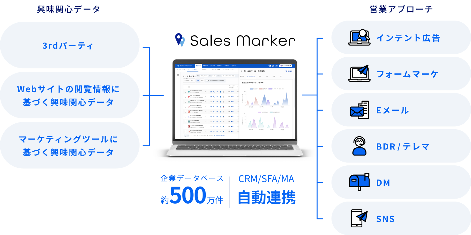Sales Markerは、約500万件の企業データベースとインテントデータ(興味関心データ)を組み合わせて活用することができるBtoBセールスインテリジェンスです。ニーズが顕在化している顧客、つまり商談・受注に至る可能性が高い企業にターゲットを絞り、広告・メール・フォーム・コールといったマルチチャネルを活用しながら、効率的・効果的にアプローチする最新の営業手法「インテントセールス」を実現します。