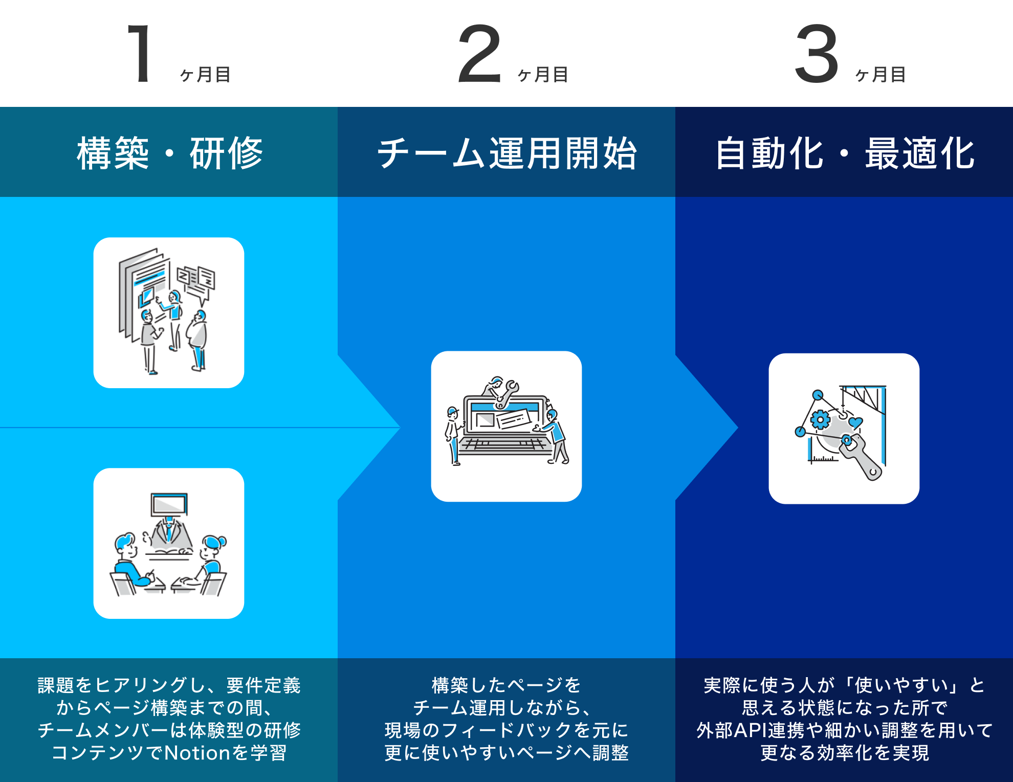 Notionは確かに多機能ですが、レベルに合わせた学習を行えば一個一個はシンプルで簡単なものです。いとなみでは、Notion研修・育成のプロが組み立てたプログラムによるボトムアップ教育を行い、ITリテラシーが高くない方でもNotionを使える状況へ導きます。