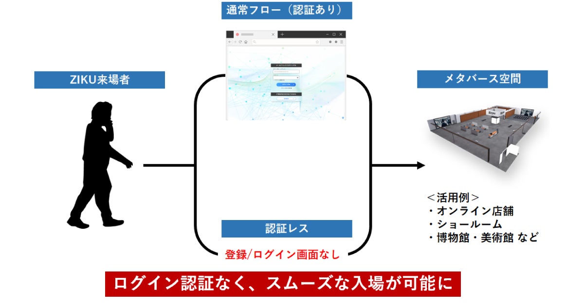 これまで「ZIKU」のメタバース空間への入場には事前の来場者登録およびユーザー認証(ログイン)が必要でしたが、今回のアップデートによりユーザー認証を経ずに入場する形式を選択することが可能になりました。これに伴い、企業のWebサイトから直接メタバース空間へリンクし、アバターで歩くことのできるバーチャルショールームや、オンラインの店舗スペースなどへの活用が可能となります。