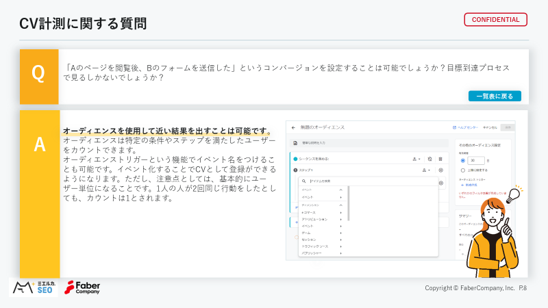 Faber Companyが10年以上にわたる検索エンジンマーケティングの知見をもとに、AIを活用して開発したSEOプラットフォーム。(1)コンテンツ企画・制作・評価・改善に加え、競合サイトを含むSEOパフォーマンス計測ができるツール、(2)セミナーや動画など自律的に学べる学習コンテンツ、(3)個別コンサルティング の三位一体で、インハウス(導入企業内)でのSEO・コンテンツ施策を支援する。