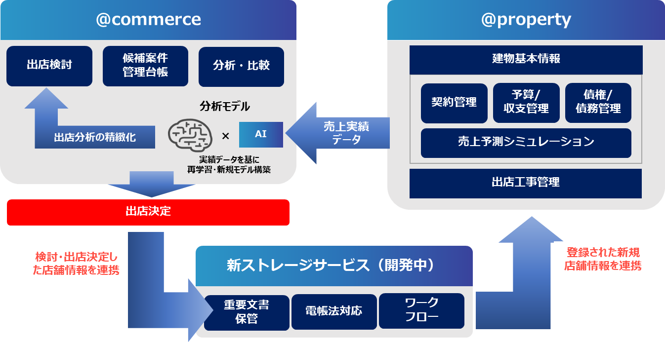 @commerce(アットコマース)に、当社の賃貸管理サービスである@property(アットプロパティ)及び開発中のストレージサービスを連携することで新規出店検討から既存店舗の業務効率化、運営管理、改善までワンストップでご提供いたします。連携につきましては、12月以降に順次行う予定です。