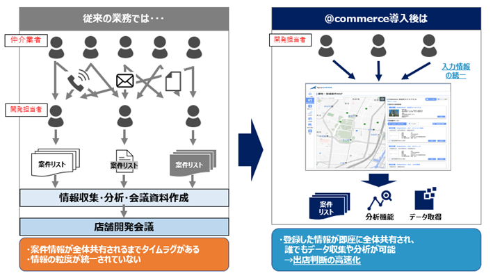 多店舗展開企業様における新規出店の課題は「候補物件や競合情報の共有」「新規出店時の売上予測」「出店経緯や判断等の情報の一元化」などがあげられます。これらの課題を解決するための店舗開発支援クラウド「@commerce(アットコマース)」は、店舗開発に関わる大量のデータを一元管理・共有するとともにデータに基づいた商圏分析、競合分析、売上予測により、素早い出店判断を実現します。