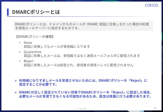 なかでも、最も有効な手法はDMARCで、理由としては送信元の正当性とメール内容の正当性の両面で認証していること、さらにDMARCポリシーとして、認証失敗時に受信者がメールの扱いをNone、Quarantine、Rejectに設定することの利点が述べられました。