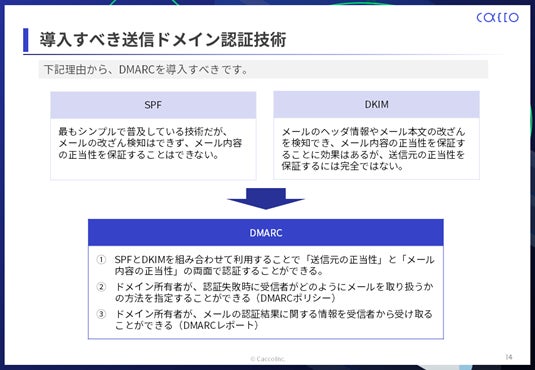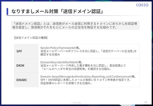 まず、DMARC導入によるなりすましメール対策では、SPF/DKIM/DMARCの3つの送信ドメイン認証について、それぞれのメリット、デメリットを交え特徴の説明がありました。