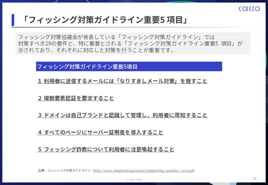 対策すべき29の要件と特に重要とされる「フィッシング対策ガイドライン重要5 項目」が示されており、それぞれに対応した対策を行うことが重要であることが説明されました。