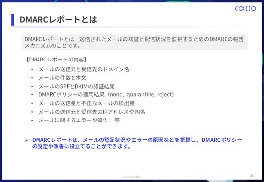 さらに、DMARCレポートの活用により、ドメイン所有者がメールの認証結果に関する情報を受信者から得られるという利点も述べられました。しかし、レポートがシステム部門の方以外には見慣れない形式であること、また、送信元のIPアドレス毎に送られるため、企業によっては1日に数十〜百以上のレポートを確認する必要があることから対応が煩雑であることが、課題として指摘されました。