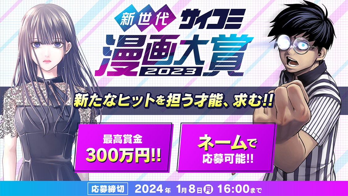 最高賞金は300万円。受賞者全員に担当編集がつき、大賞と金賞の受賞者には、「サイコミ」での連載デビューを保証します。