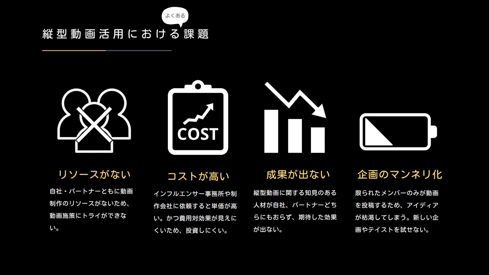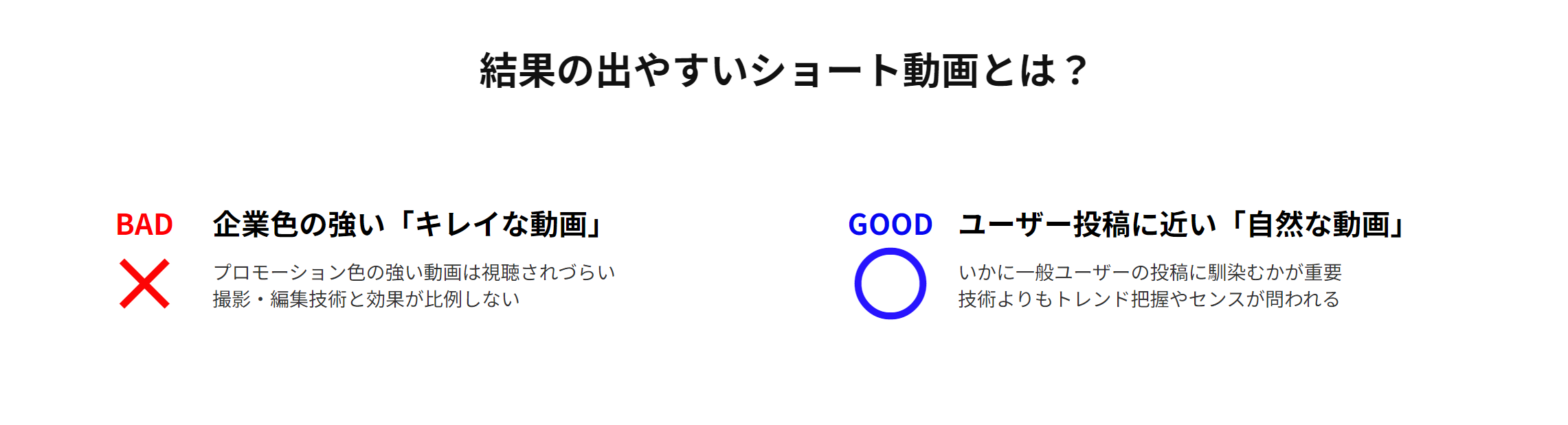 加えてショート動画においては、パフォーマンスの高い動画の傾向が従来の動画とは異なります。ユーザー投稿に馴染むような自然かつ親近感のある動画表現が求められ、また撮影方法やテンポ感などもショート動画ならではの知見が必要です。しかし、ショート動画の領域で強みを持つ企業はまだ少なく、自社にあった制作先を見つけることは簡単ではありません。