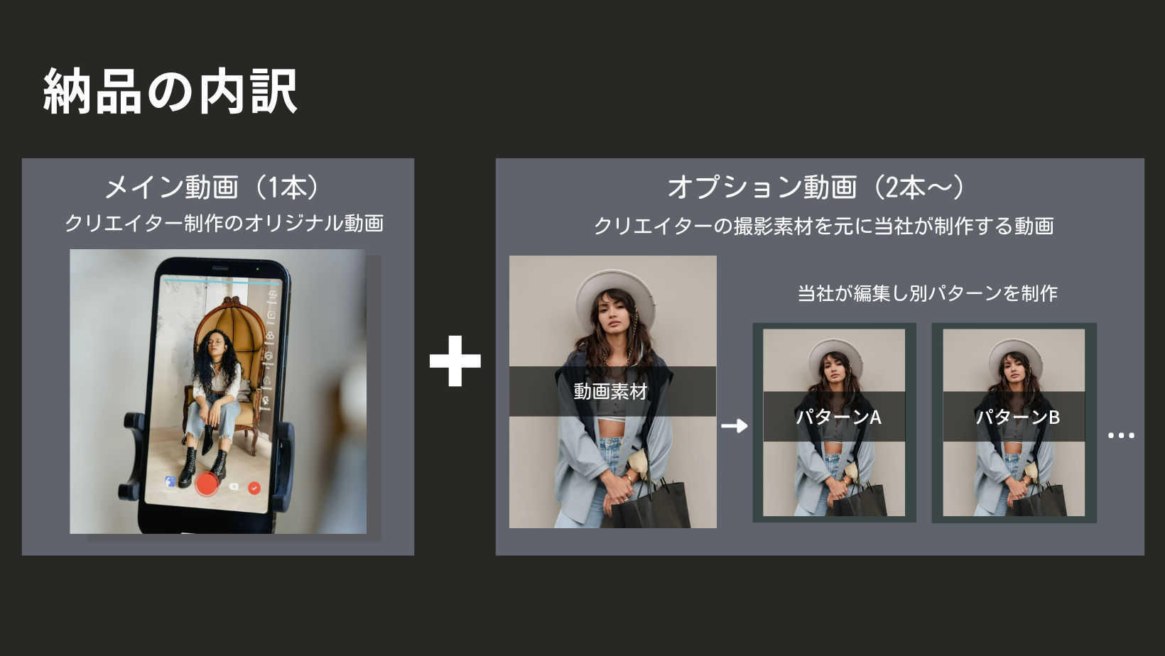 今回の新プランでは、制作を依頼したインフルエンサー・クリエイターのオリジナル動画に加えて、撮影素材を元にした複数パターンの動画を、3本60,000円~ / 最短10営業日と低価格かつスピーディーに提供します。