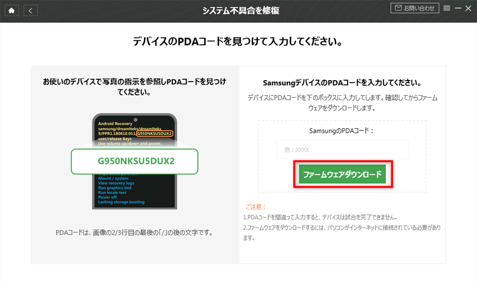 Step 4.AndroidスマホでPDAコードを探して入力します。その後、「ファームウェアダウンロード」ボタンをクリックしたら、ファームウェアのダウンロードが自動的に開始されます。
